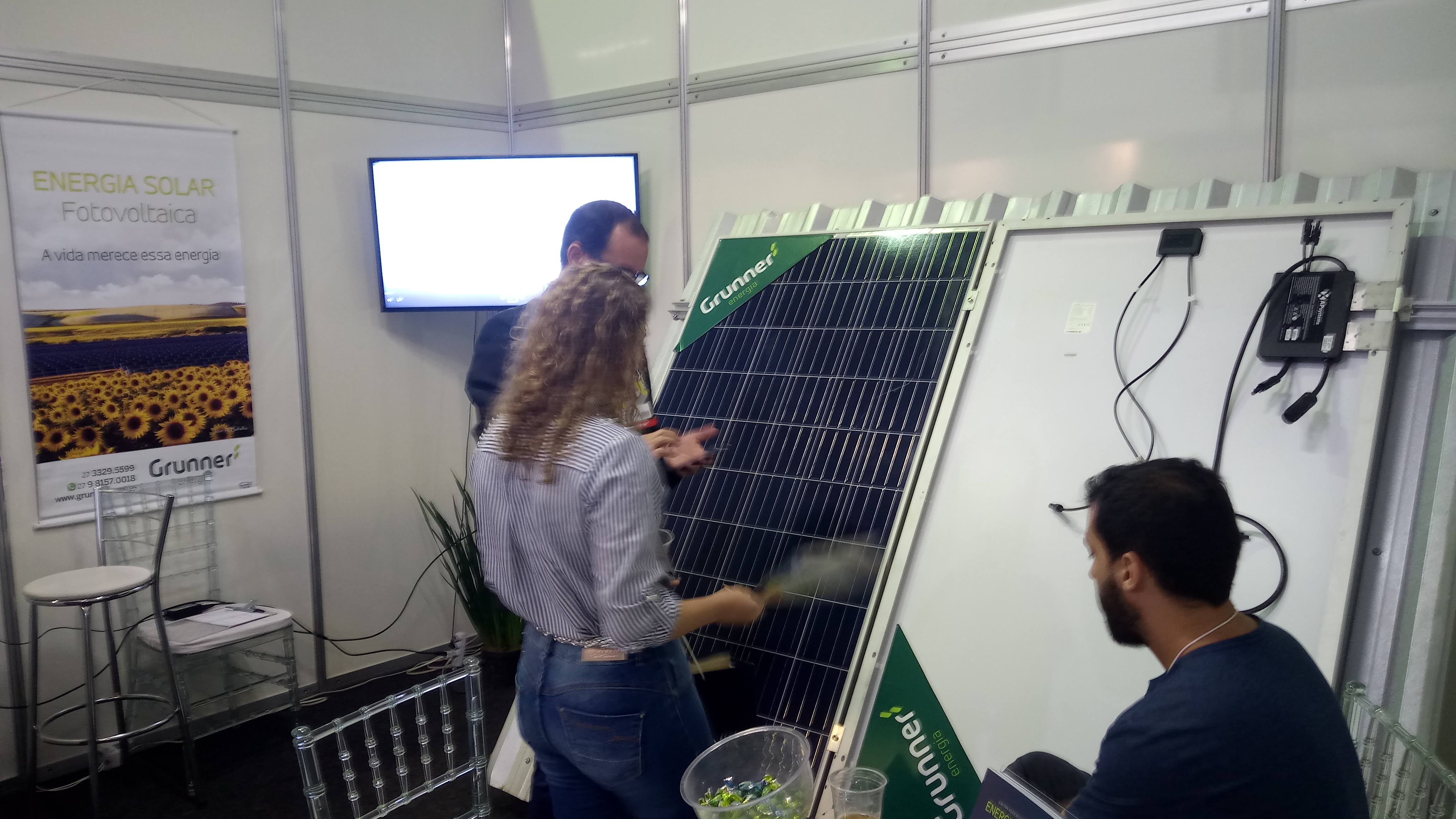 No stand apresentamos material promocional apresentando o passo-a-passo da instalação e forma de funcionamento, além de um show room contendo painéis fotovoltaicos e um microinversor.